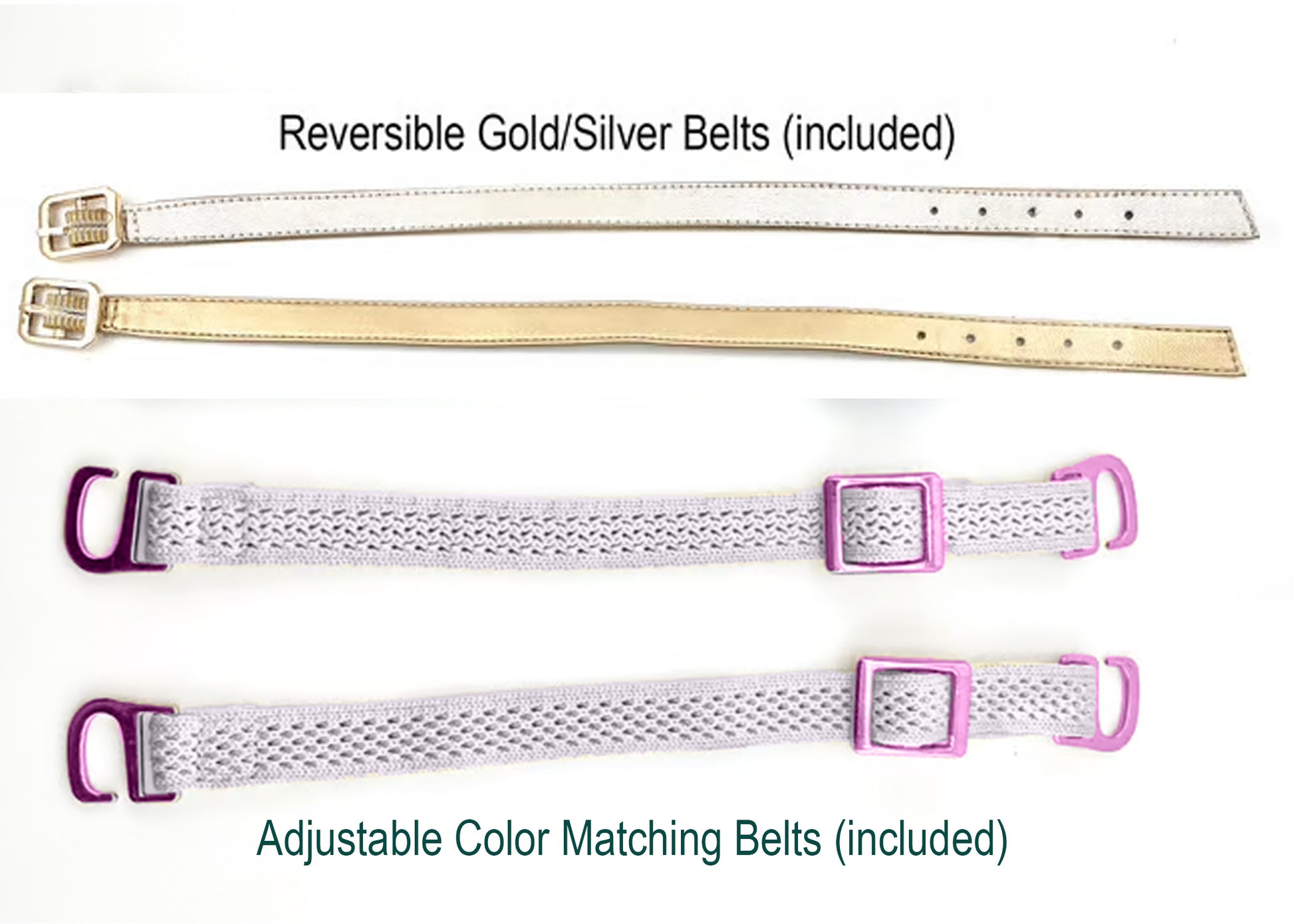 - 2 sets of belts: an adjustable woven belt set and gold/silver reversible belts.