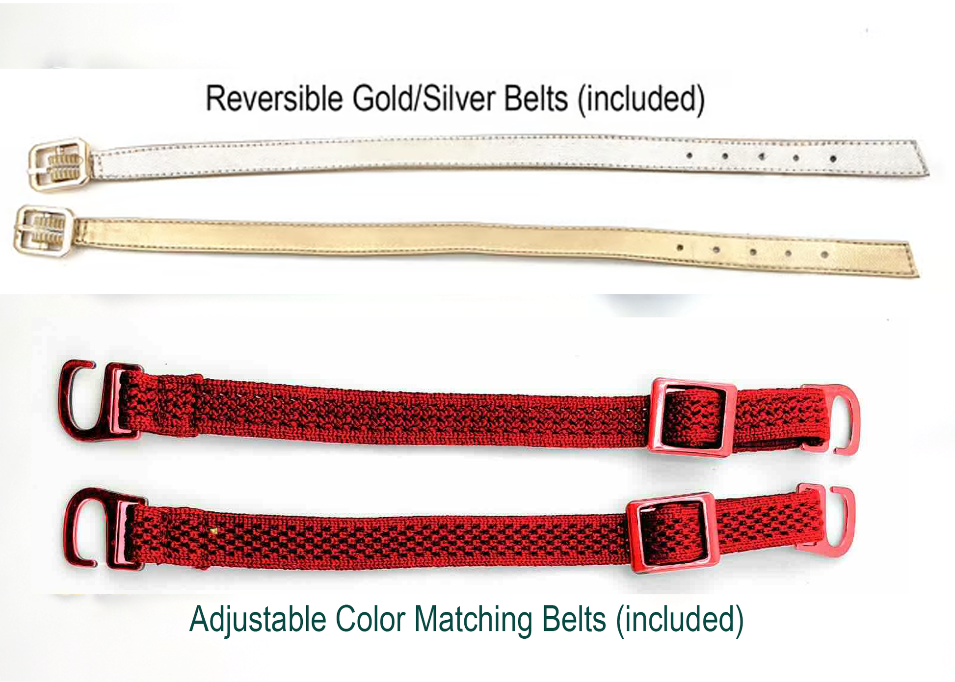 - 2 sets of belts: an adjustable woven belt set and gold/silver reversible belts.