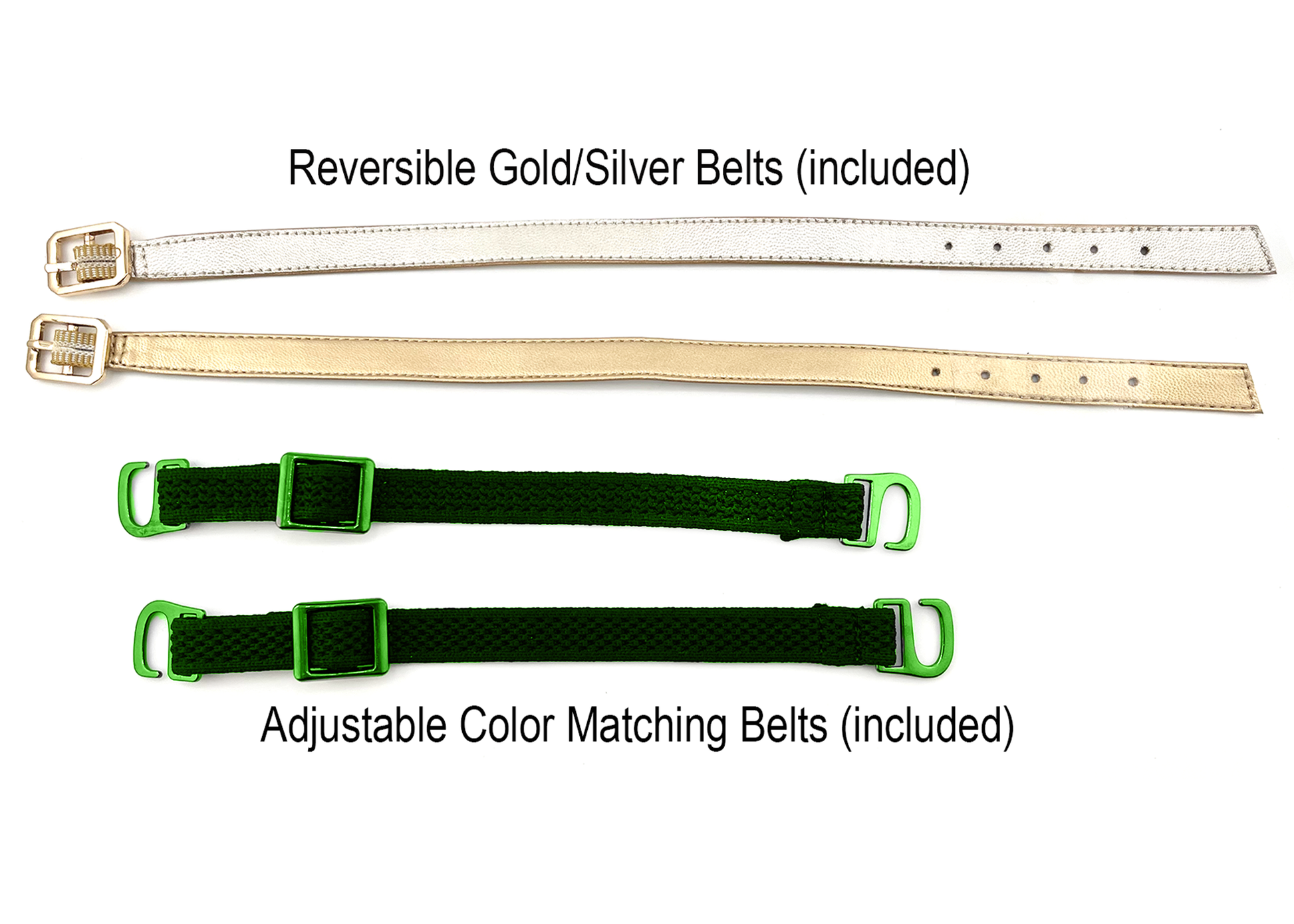 - 2 sets of belts: an adjustable woven belt set and gold/silver reversible belts.